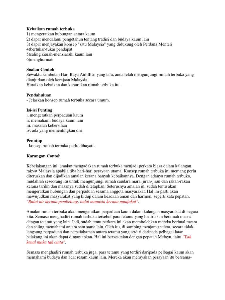 Kepentingan mengadakan rumah terbuka karangan spm. Hal ini berlaku disebabkan oleh kesibukan masyarakat dalam berusaha mencari nafkah untuk menyara kehidupan masing. Majlis Rumah Terbuka.